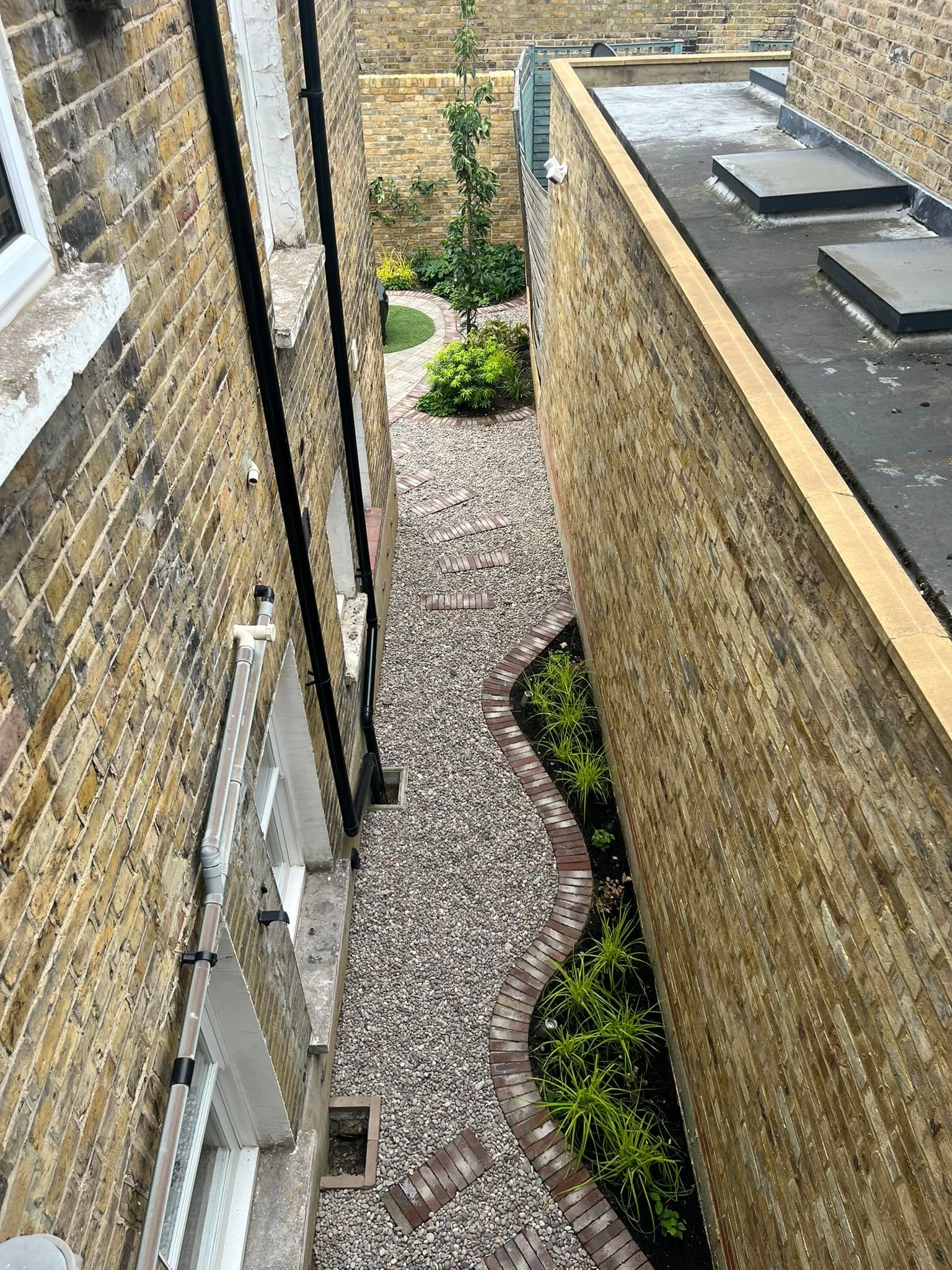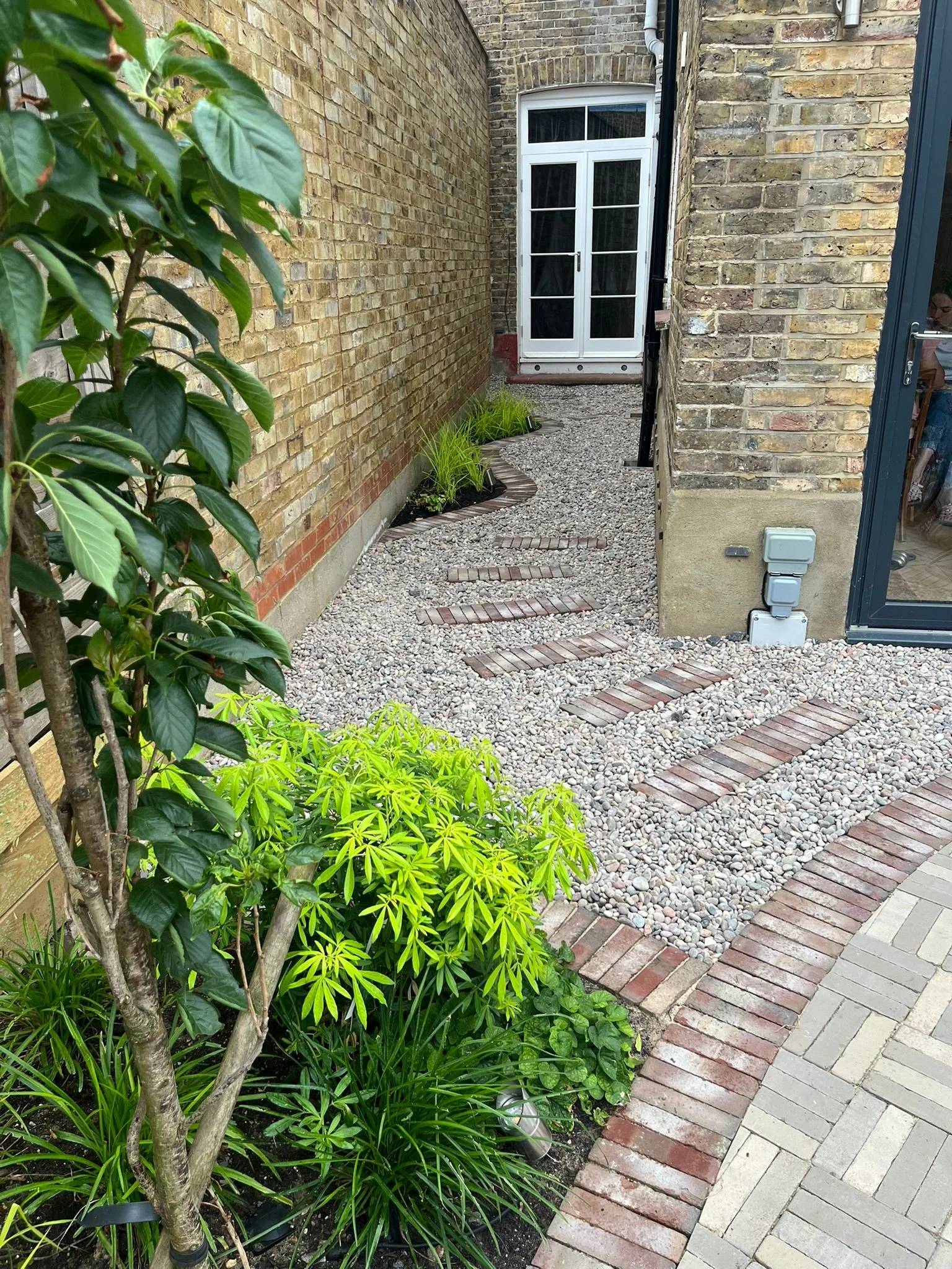 To achieve this, I introduced a gentle route through the space, encouraging movement while subtly reducing overlooking. A mix of soft lines, rustic bricks, and gravel enhances texture and warmth, ensuring the garden feels welcoming in all seasons. Two carefully placed feature trees will draw the eye upwards, creating a sense of height and enclosure while offering blossom in spring, vibrant foliage in autumn, and sculptural form in winter.