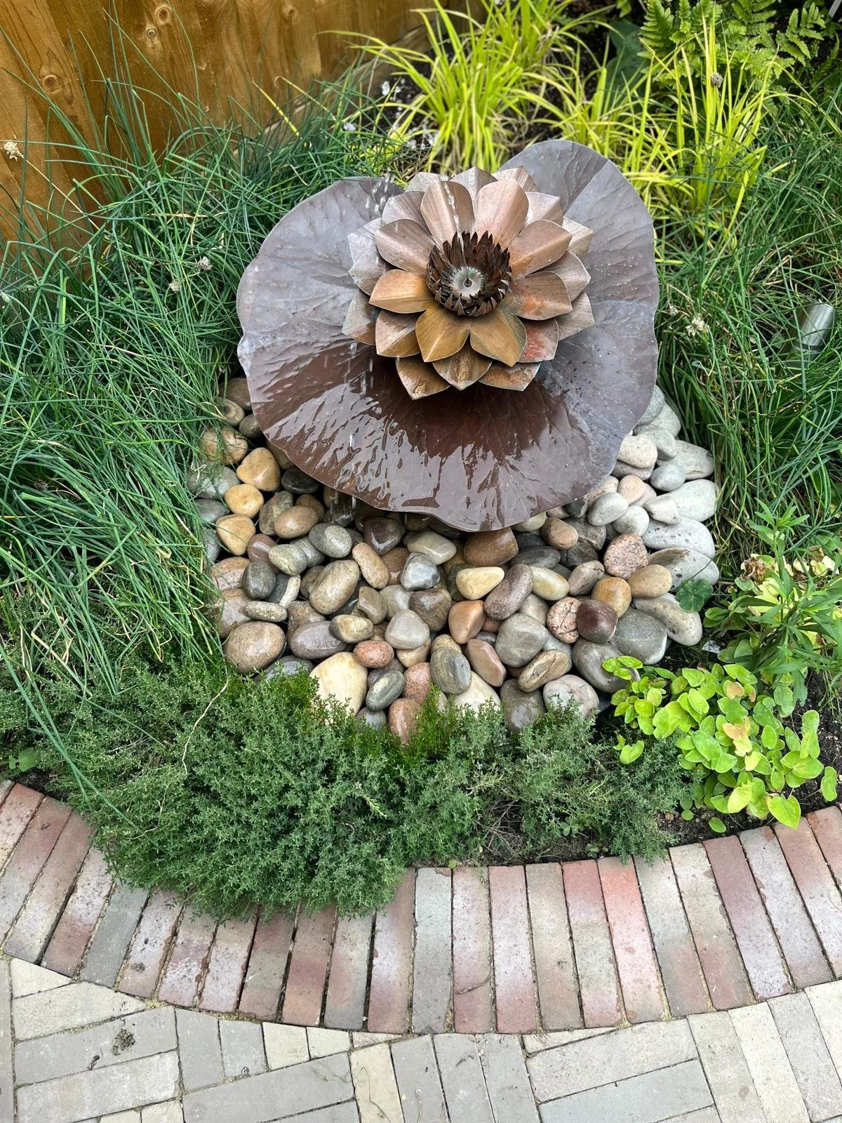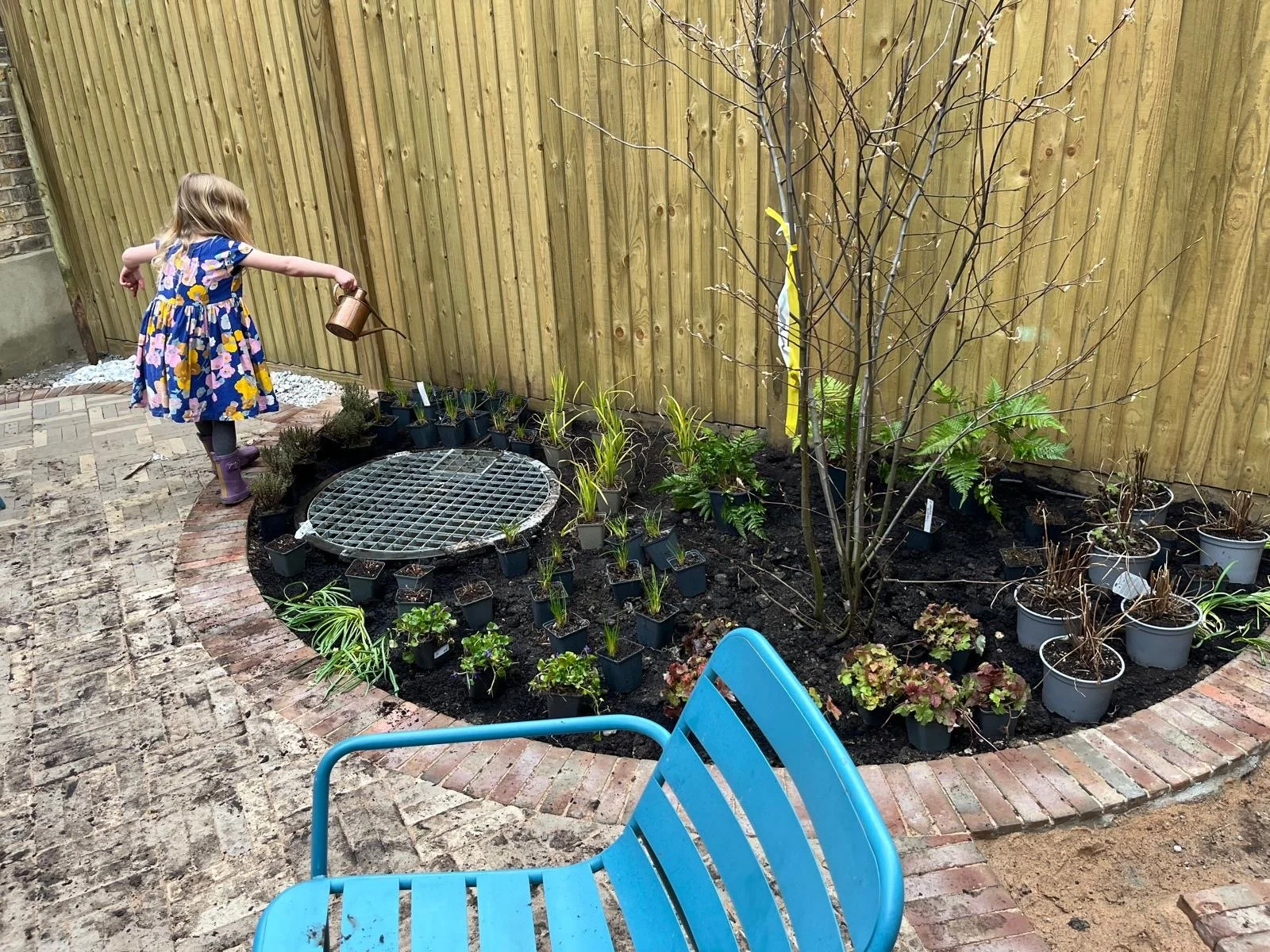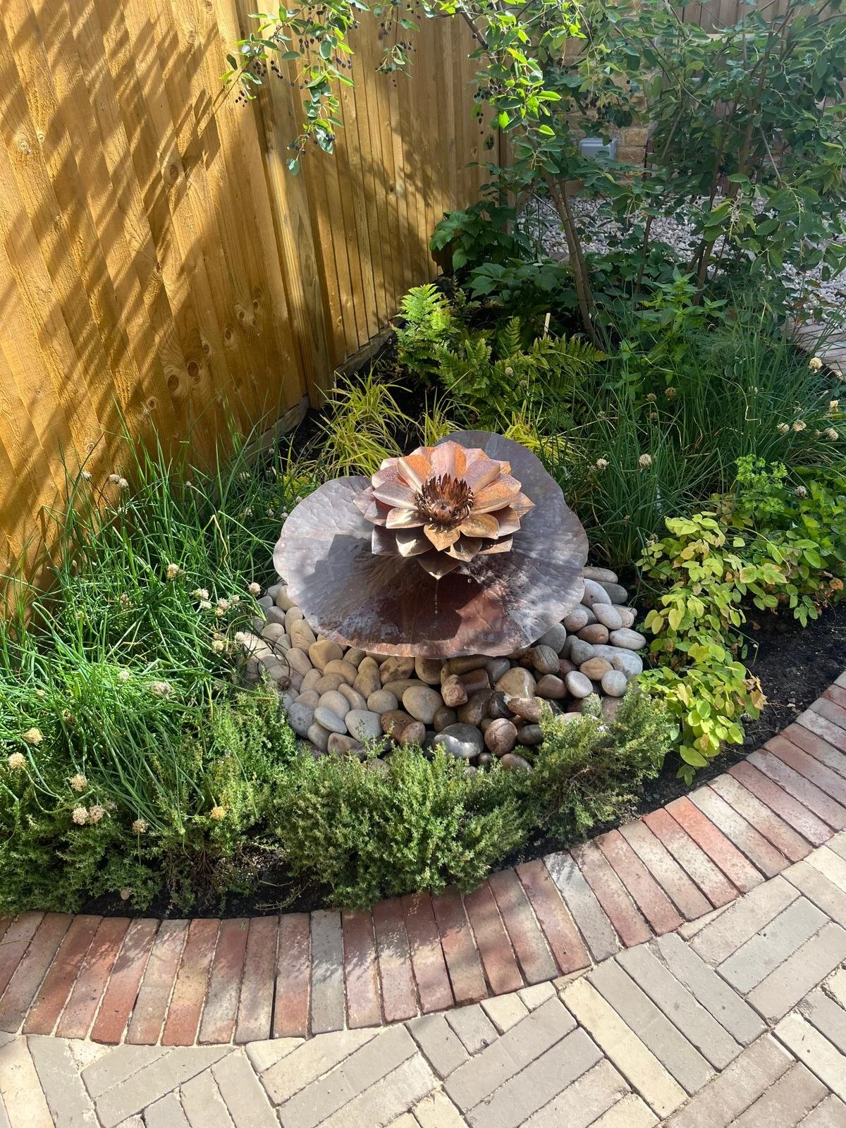 Children will be drawn naturally to the whimsical stepping stones, intricate brick edgings, and the gentle movement of water, adding playful details that enrich the garden’s charm. This space is designed to grow with the family, evolving through the seasons while always feeling like home.